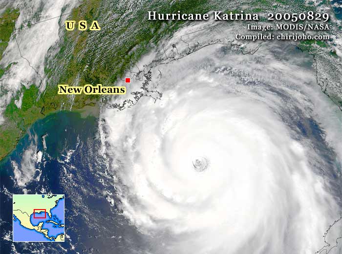 The disastrous hit of Hurricane Katrina on the southern coast of the US became the worst storm disaster in American history. Heavy rain and high sea waves drowned New Orleans, the city of 480,000 people, in seawater. This MODIS satellite image shows a closer view of deadly Katrina, before its landfall. This report was written after the landfall, and the latest information indicated that some hundreds of people might have killed by the disaster. In yesterday's MODIS image, the flooded region is visible through clouds (figure 01). Over 80% of New Orleans was flooded, and damage easily exceeded US$25 billion within the first few days.