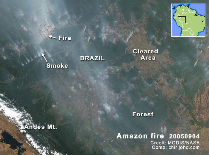 This MODIS satellite image is showing uncontrolled forest fire set for land clearance by Brazilian farmers. Fire is destroying even natural forests close to already cleared forests. These fires pose no major threat to villagers, but they contribute to global warming. Satellite data are a highly effective source for detecting and recording these types of fires in very remote locations.
