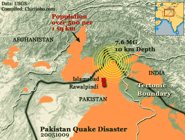 A disastrous big earthquake occurred in northeast Pakistan, in the disputed area with the Indian border. Magnitude 7.6 quake centred just near the Muzzafarabad city, which has about 0.2 million people. The weak building construction, shallow depth of the quake epicentre (10km), and aftermath landslides increased the death toll dramatically, passing 20,000 within the first three days. The map shows the hilly terrain of the region with some cities and the tectonic plate boundary. Pakistan government news says the Muzzafaeabad city has completely destroyed. Telephone, power, water, and other public services were downed and mountain villages became inaccessible due to damaged roads. Pakistan Meteorological Department says this is the worst quake hit this area in the last 100 years. The disaster occurred 10 months after the historical tsunami tragedy in Asia.