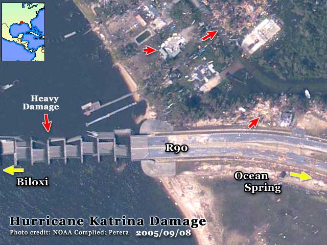 Hurricane Katrina, which demolished coastal Louisiana, Mississippi, and Alabama, became the costliest natural disaster in US history. Latest records say the death toll has passed 1,163 people, with a total economic damage of about $200 billion. This NOAA aerial photograph shows one of the hardest hit areas of the hurricane, the Biloxi city region, east of the New Orleans city of Louisiana. See the completely collapsed bridge and other damage locations (red arrows). The damage was accompanied by the after-hurricane flood caused by the broken levee system that protects New Orleans from Lake Pontchartrain. An estimated 1 million people were displaced, and about 5 million people lost power. Hurricane Katrina was a Category 5 hurricane and was also the 11th of the 21 storms that hit in this hurricane season.