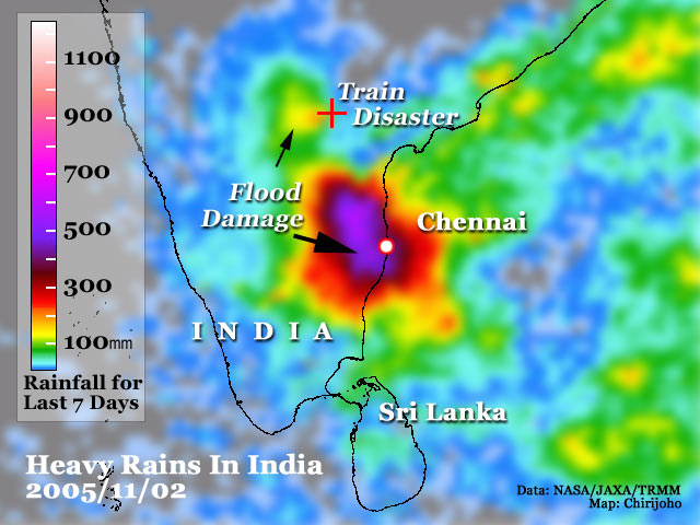 Heavy rains associated with a storm flattened India's southeast region, including Chennai city in the Tamil Nadu district. Remote areas suffered severe flooding, including a fatal train accident near the Valigonda city in Andhra Pradesh (marked as a red + on the image). The train crashed into a river after the track was washed away by flood. The image shows these intense rains recorded over the last 7 days. Authorities say about 100 people or more were killed by the train disaster, apart from about another 100 deaths caused by the flood. Satellite data-based image shows heavy rains in purple colour (over 500 mm within the 7 days). These rainfall data are coming from the TRMM satellite, which is a joint project of the USA and Japan. TRMM data are useful to monitor rainfall conditions in remote areas and over oceans.