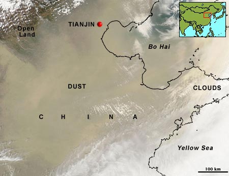 Yellow dust is a historical environmental hazard for millions of people in China. This MODIS image issued by NASA shows one of the latest dust events, which covered a huge region of eastern China, including the Bohai Sea and Tianjin city. The source of the dust storm is the Taklimakan Desert, which is located northwest of the Bosai Sea area. According to the Chinese meteorological information, this dust storm became the severest recorded so far in 2009. Researchers suspect that these dust storms are also carrying industrial pollutants into populated areas in China and surrounding countries like Korea and Japan.