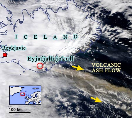 The massive Eyjafjallajökull volcano in southeast Iceland erupted violently, releasing very thick ash clouds towards Europe. The ash cloud, which blocked air traffic in a number of major airports in the UK, is visible in this April 15th MODIS sensor of the Terra satellite image. See the few hundred of km wide yellowish cloud line. Ash flow has travelled more than 1000km and reached the UK, making the airspace unsuitable for traffic. According to a NASA document, volcanic ash consists of tiny jagged particles of rock and may cause engine failure in aircraft. But, radar is not capable to detect this deadly ash clouds. Though the volcano gave no deaths apart from health risks, the economic impact on the UK will be very high, as over 1 million passengers have stranded.