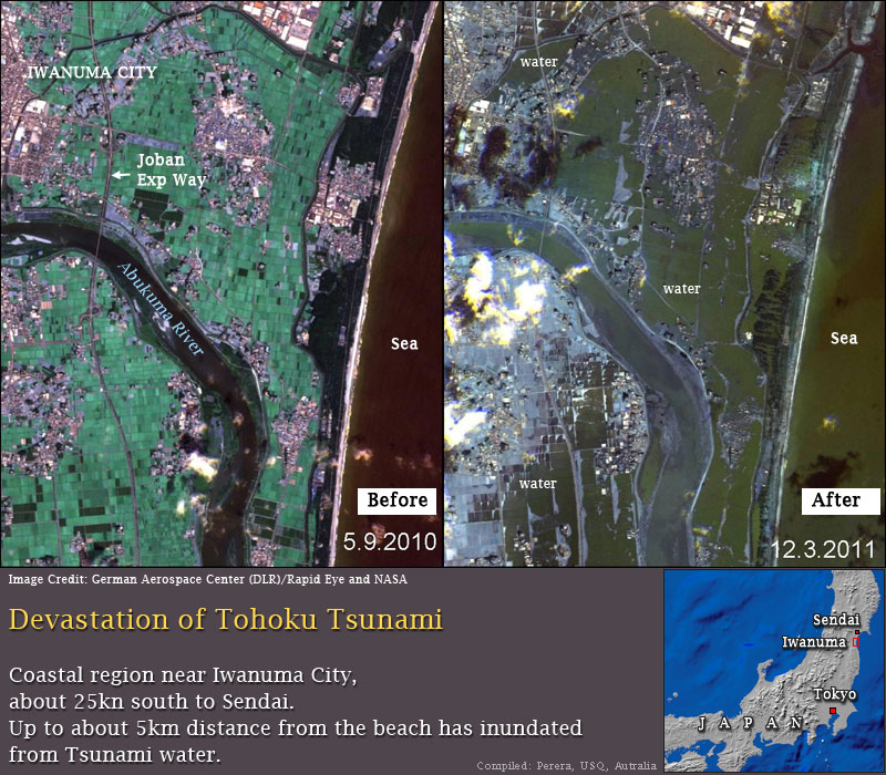 A massive earthquake hit the north-eastern coastal area of Japan on 11th March 2011, Killing 10,000s of people. The earthquake has triggered a giant tsunami, erasing many towns and villages along the coast. The extent of inundation from this deadly tsunami caused by the magnitude 8.9 earthquake is depicted in this satellite image pair. Sea water entered the land as deep as over 5km in some locations. Apart from the life and property damage, massive environmental damage or change has also monitored in the region.