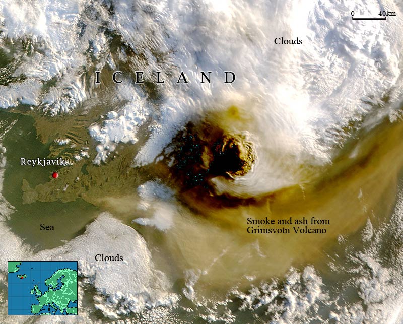 One year after the eruption of the Eyjafjallajokull volcano, another volcano, Grimsvotn, has erupted in Iceland, causing panic among northwest European countries. The latest eruption sent massive ash and smoke clouds into the air since 22nd May, 2011. This MODIS image shows the spectacular view of the volcanic eruption. The previous eruption cost well over $1.5 billion for the air transportation industry. Some airlines have already cancelled flights in northwest European countries. Even though Grimsvotn did not cause a similar scale impact as Eyjafjallajokull volcano, a potential risk remains.